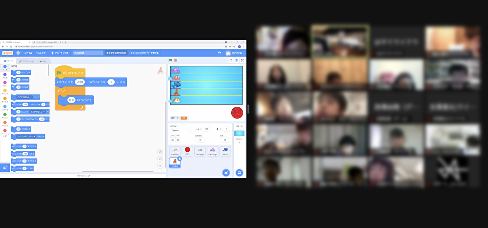 1日目は、プログラミングのイメージや基礎知識を参加者の方と共有した後、マイクラッチコースとゲーム制作コースに分かれてレクチャーを行いました。